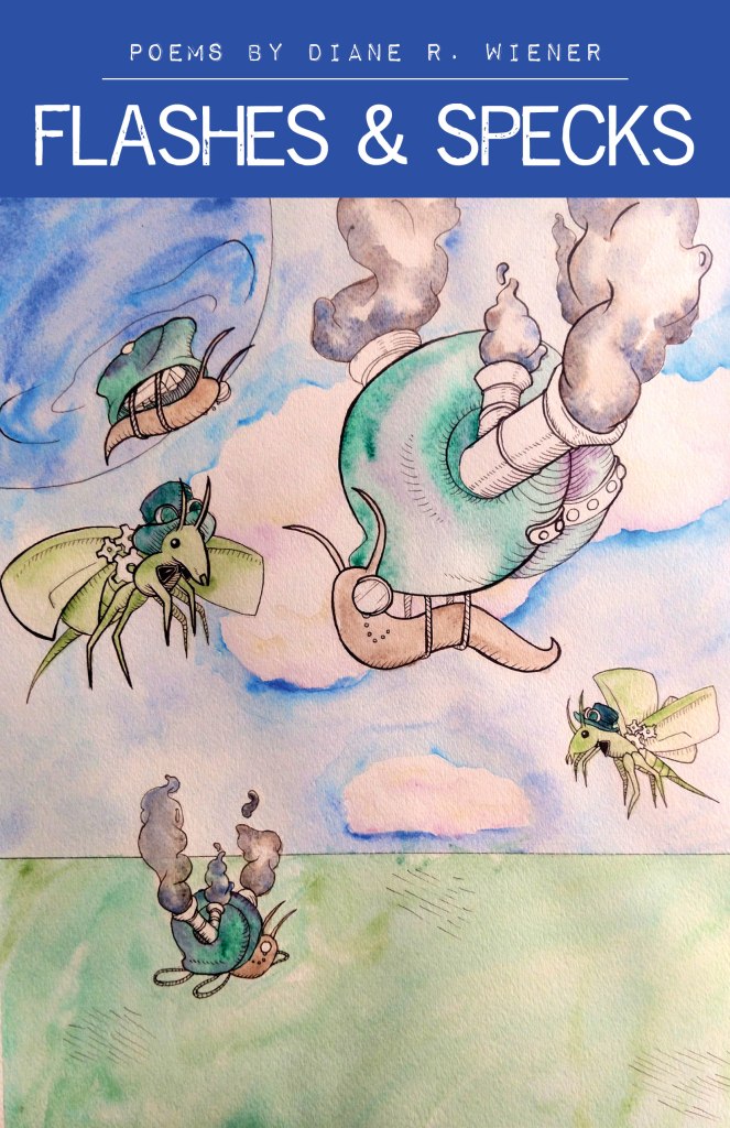 [Image description: Full-color book cover featuring original artwork—“The Origins”—by Lucy Wales. Book title in rectangular banner, top; deep blue background with white sans serif, capitalized lettering. The words “Poems by Diane R. Wiener” (at the very top) look as if made with an old school label maker, with the effect of appearing to be embossed. The words “Flashes & Specks” (after a white horizontal line) have blue spots in the lettering, as if mottled—possibly like a Crip appaloosa horse. The main scene on the cover is a fantastical world depicting steampunk grasshoppers, slugs, and snails. The slugs are suspended from shells (like hot air balloons) as they travel from a watery planet-orb through the sky to the land below. When they land, the shells connect to their bodies, and they become snails. The grasshoppers, aloft, have top hats and gears; the slugs-to-snails have steam engines on their shells (with accompanying, emergent smoke) and wear monocles. The artwork is multi-media—ink with watercolor. The color palette is a reflective mixture of the environments depicted—blues, greens, grays, and tans, with some creams, ivories, whites, and, indeed, magic.]